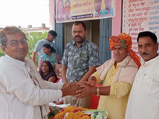 इस अवसर पर ग्रामवासियों ने सचिव ओमप्रकाश शर्मा का पगड़ी बांधकर शाल श्रीफल भेंट कर मिष्ठान खिलाकर स्वागत किया गया है।