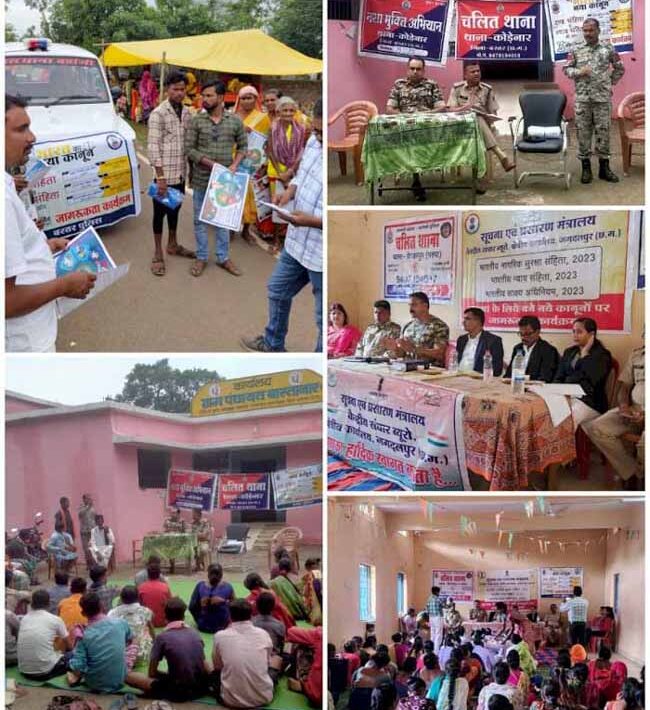 इसके साथ ही आपराधिक तत्वों की जानकारी देने और अपराधियों को पकडने में पुलिस का सहयोग करने की जनता से अपील की जा रही है। इसके साथ ही वर्तमान परिपेक्ष्य में हो रहे साइबर अपराध, सड़क दुर्घटना एवं नशीले पदार्थों के उपयोग पर रोकथाम हेतु जनता को जागरूक करने का प्रयास किया जा रहा है। वहीं 01 जुलाई 2024 से लागू होने वाले नवीन कानून के प्रति जागरूकता की भी मुहीम चलाई जा रही है। इसी क्रम में आज शनिवार को थाना कोतवाली द्वारा कालीपुर में, थाना बोधघाट द्वारा आड़ावाल में, थाना परपा द्वारा करंजी में एवं थाना कोडवार द्वारा बास्तानार में अनुविभागीय अधिकारी व थाना प्रभारी स्वयं रुचि लेकर चलित थानों का संचालन किया जा रहा है जो भविष्य में भी जारी रहेगी।