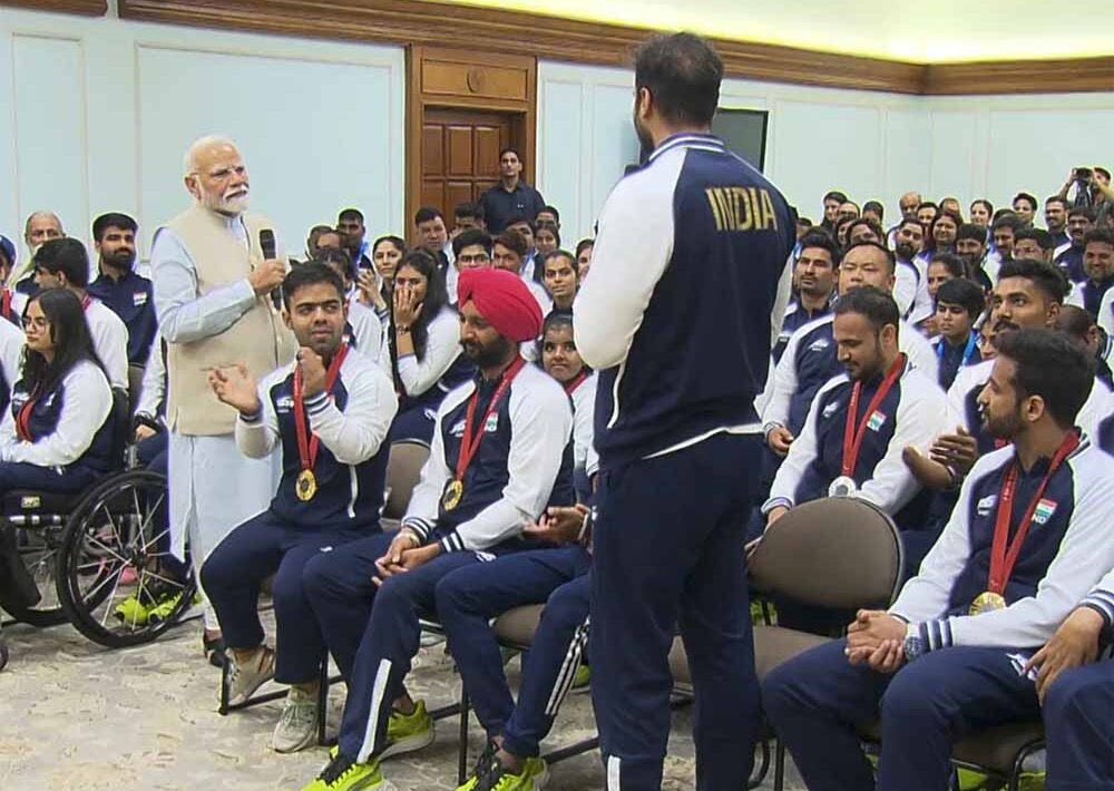 प्रधानमंत्री नरेंद्र मोदी ने गुरुवार को अपने आवास पर पेरिस पैरालंपिक में हिस्सा लेने वाले एथलीटों से मुलाकात करते हुए शानदार प्रदर्शन के लिए बधाई दी। पेरिस में पैरालंपिक खेलों में भारत ने कुल 29 पदक जीतते हुए अब तक का सर्वश्रेष्ठ प्रदर्शन किया। खेल मंत्रालय द्वारा शेयर किए गए वीडियो में प्रधानमंत्री नरेंद्र मोदी पदक विजेताओं से बातचीत करने से पहले उन्हें बधाई देते हुए नजर आ रहे हैं। इस दौरान खिलाड़ियों ने पीएम को खास चीजें गिफ्ट की। पैरालंपिक स्वर्ण पदक विजेता अवनि लेखरा ने प्रधानमंत्री मोदी को साइन की हुई भारतीय जर्सी भेंट की।
