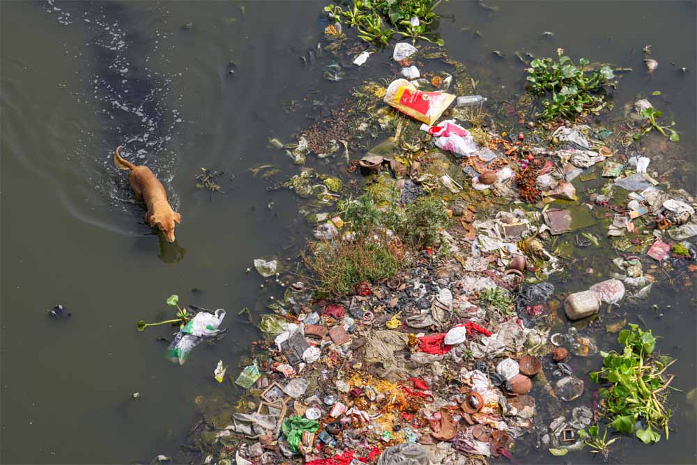 दिल्ली में यमुना नदी के किनारे पानी में तैरता कचरा