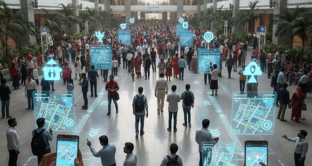 वेब आधारित सिस्टम: मुख्य प्रवेश द्वार और प्रमुख स्थानों पर QR कोड लगाए जाएंगे। स्कैन करते ही मोबाइल पर इंटरैक्टिव मैप खुल जाएगा।