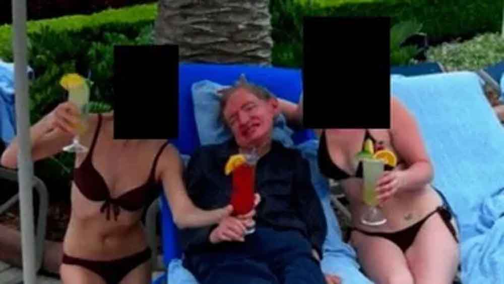 जब से एपस्टीन फाइल जारी हुई हैं, तब से अमेरिका समेत दुनियाभर में हड़कंप मचा हुआ है। कई नामी-गिरामी लोगों के नाम सामने आ चुके हैं। अब स्टीफन हॉकिंग की एक तस्वीर सामने आई है, जिसने हंगामा खड़ा कर दिया है। जेफरी एपस्टीन की फाइलों से सामने आई इस फोटो में स्टीफन हॉकिंग दो बिकिनी पहनी महिलाओं के बीच में हैं। हॉकिंग के बगल में लेटीं दोनों महिलाओं की पहचान उजागर नहीं हुई है। एक महिला हॉकिंग के दाएं ओर है, तो दूसरी बाएं ओर लेटी है। तीनों के हाथों में पेय पदार्थ है और स्टीफन हॉकिंग वाला ग्लास उनके अलावा महिला ने भी पकड़ रखा है। दोनो महिलाओं के चेहरे को काले रंग से ढक दिया गया है, ताकि पहचान सामने न आए। दोनों ने ब्लैक कलर की बिकिनी पहन रखी है।