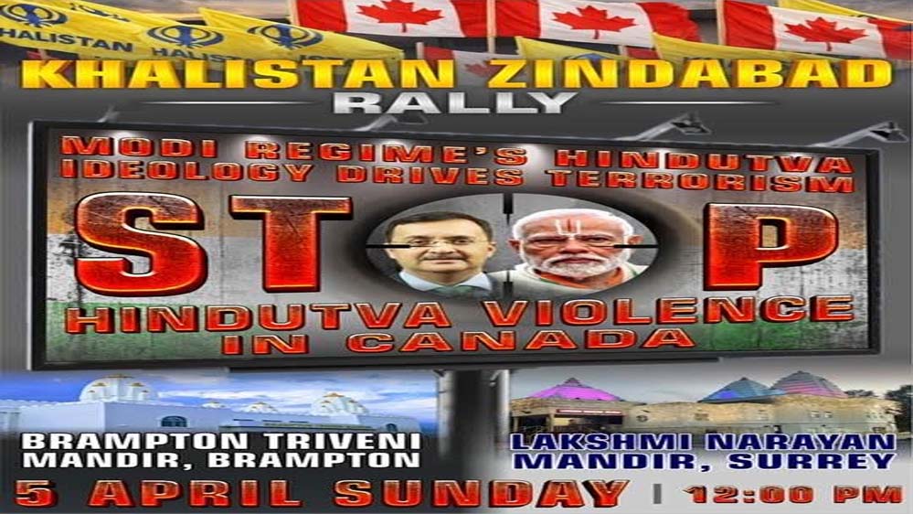 खालिस्तानियों की धमकी: CBKE ने सोशल मीडिया पर पोस्ट करके साफ ऐलान किया कि 5 अप्रैल को ब्रैम्पटन के त्रिवेणी मंदिर और सरे के लक्ष्मी नारायण मंदिर के बाहर 'खालिस्तान जिंदाबाद रैली' निकाली जाएगी। ये रैलियां सीधे मंदिर के गेट पर होगी।