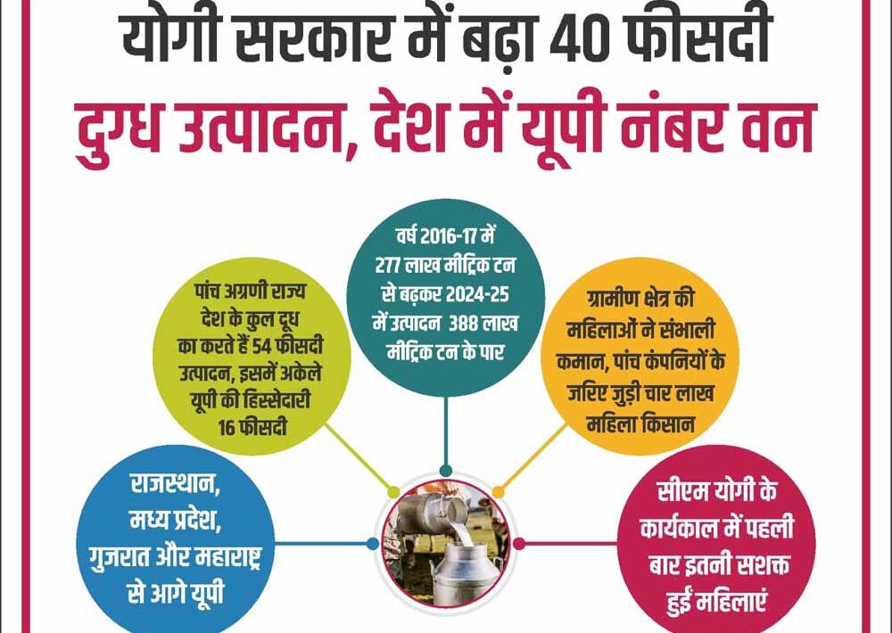 सीएम योगी के कार्यकाल में दुग्ध उत्पादन में जबरदस्त उछाल दर्ज हुआ है। वर्ष 2016-17 में जहां उत्पादन 277 लाख मीट्रिक टन था, वहीं वर्ष 2024-25 में यह बढ़कर 388 लाख मीट्रिक टन के पार पहुंच गया है।
