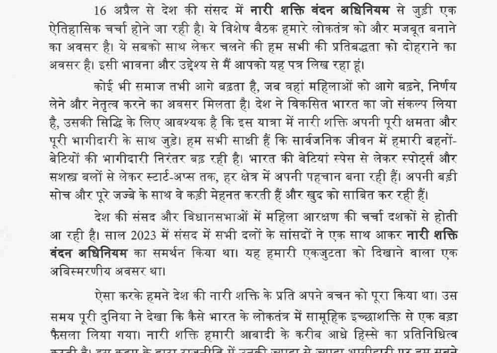 पीएम मोदी ने अपने पत्र में लिखा, '16 अप्रैल से देश की संसद में नारी शक्ति वंदन अधिनियम से जुड़ी एक ऐतिहासिक चर्चा होने जा रही है. ये विशेष बैठक हमारे लोकतंत्र को और मजबूत बनाने का अवसर है. ये सबको साथ लेकर चलने की हम सभी की प्रतिबद्धता को दोहराने का अवसर है. इसी भावना और उद्देश्य से मैं आपको यह पत्र लिख रहा हूं.'