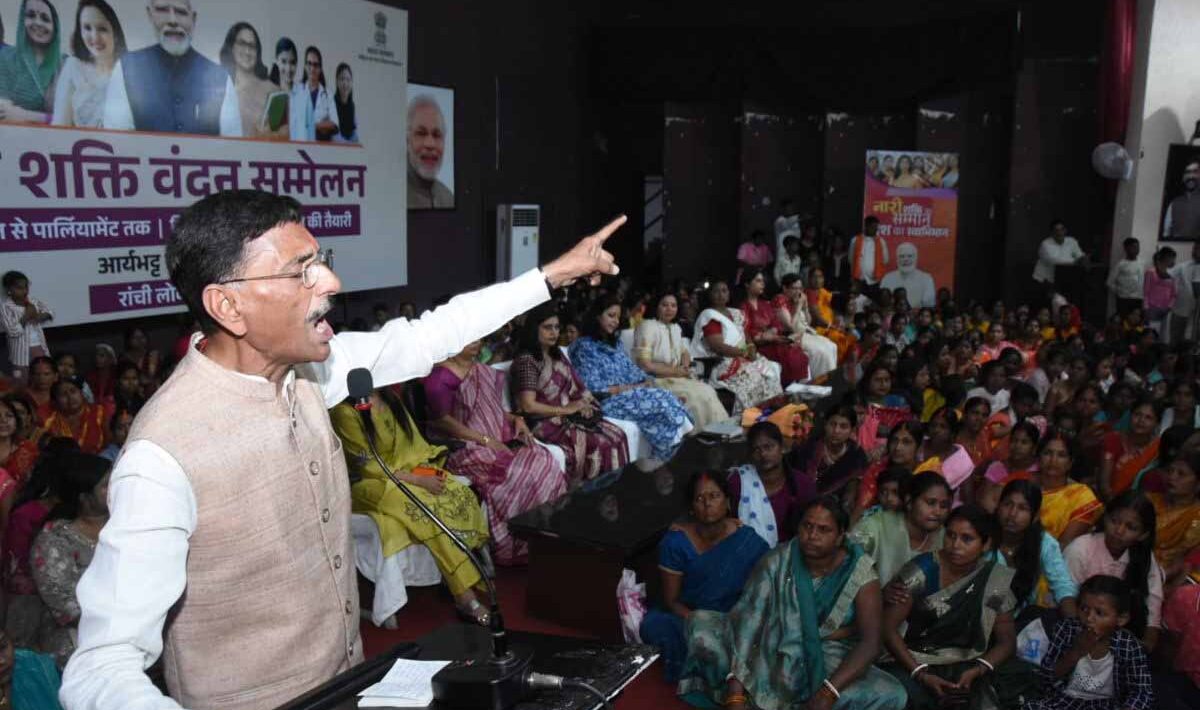 झारखंड के रांची में नारी शक्ति वंदन अधिनियम पर मंगलवार को आर्यभट्ट सभागार मोरहाबादी में सम्मेलन हुआ. इसमें हजारों महिलाएं शामिल हुईं. पूरा हॉल महिलाओं से खचाखच भरा था. नारी शक्ति वंदन अधिनियम को लेकर मौजूद जनसमूह ने पीएम नरेंद्र मोदी के प्रति आभार व्यक्त किया. ‘पंचायत से पार्लियामेंट तक, निर्णय में नारी, नव भारत की तैयारी’ थीम पर आधारित यह कार्यक्रम पूरी तरह से नारी शक्ति को समर्पित रहा.