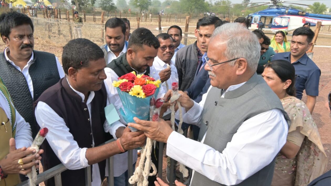 मुख्यमंत्री श्री भूपेश बघेल आज अपने बिलासपुर प्रवास के दौरान ग्रामीणों से भेंट मुलाकात करने और शासन की योजनाओं की जमीनी हकीकत जानने जिला बिलासपुर के तखतपुर विधानसभा के ग्राम खैरी पहुँचे। खैरी पहुंचने पर हेलीपैड पर अधिकारियो, जनप्रतिनिधियों एवं आमजनों ने पुष्प गुच्छ, गुलदस्ता भेंटकर उनका आत्मीय स्वागत किया। हैलीपेड में मुख्यमंत्री को देखने ग्रामीणों में भारी उत्साह था वे मुख्यमंत्री को अपने बीच पाकर काफी खुश नजर आए। मुख्यमंत्री को देखने हेलीपैड पर ग्रामीण, बच्चे, युवा, महिलाएं और बुजुर्ग बड़ी संख्या में पहुचे थे। मुख्यमंत्री श्री बघेल ने सभी जनता का स्वागत स्वीकार करते हुए सभी का अभिवादन किया। ग्राम खैरी में मुख्यमंत्री श्री बघेल के स्वागत के दौरान तखतपुर क्षेत्र की विधायक और संसदीय सचिव श्रीमती रश्मि आशीष सिंह और जनप्रतिनिधि मौजूद रहे।