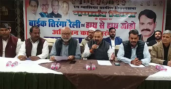 रैली में दो हजार बाइक होंगी : ग्वालियर ग्रामीण विधानसभा में 26 जनवरी को तिरंगा रैली के साथ हाथ से हाथ जोड़ो अभियान का शुभारंभ कांग्रेस द्वारा किया जाएगा. कांग्रेस के प्रदेश महासचिव साहब सिंह गुर्जर, कांग्रेस विधायक सतीश सिंह सिकरवार और कांग्रेस के जिला अध्यक्ष देवेंद्र शर्मा ने बताया कि 26 जनवरी को सुबह 10 बजे मोहनपुर से कांग्रेस की बाइक तिरंगा रैली का शुभारंभ होगा. इसमें दो हजार से बाइक पर तिरंगा लेकर लोग निकलेंगे. यह यात्रा ग्वालियर ग्रामीण विधानसभा क्षेत्र के विभिन्न मार्गों से होते हुए बेहट तक पहुंचेगी.