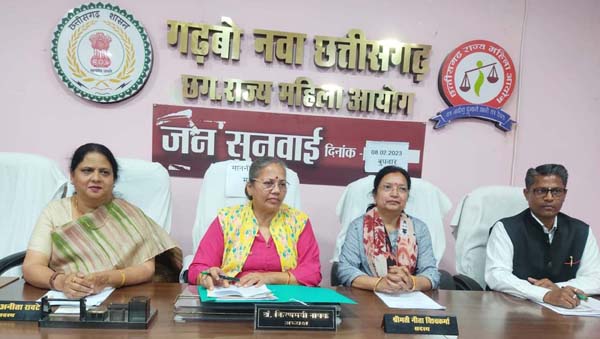 राज्य महिला आयोग की अध्यक्ष डॉ. किरणमयी नायक एवं सदस्य डॉ अनीता रावटे, श्रीमती नीता विश्वकर्मा ने आज राज्य महिला आयोग कार्यालय शास्त्री चौक रायपुर में महिला उत्पीडन से संबंधित प्रस्तुत प्रकरणों पर जनसुनवाई की। आयोग की अध्यक्ष डॉ नायक ने अपने कार्यकाल की आज 158 वीं जनसुनवाई की। रायपुर की आज 84 वीं जनसुनवाई में कुल 35 प्रकरण रखे गये थे। इनमे से 4 प्रकरण नस्तीबद्ध किये गए, शेष प्रकरण को आगामी सुनवाई में की जाएगी।