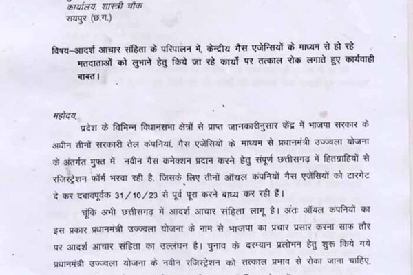 रायपुर प्रदेश कांग्रेस कमेटी के प्रभारी महामंत्री मलकीत सिंह गैदू ने मुख्य निर्वाचन पदाधिकारी कार्यालय को पत्र लिखकर तीन तेल कंपनियों और गैस एजेंसियों के …